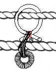 Lecz należy pamiętać, że metoda owijania liną żagla zwiniętego wzdłuż sztagu RAZEM z liną samego sztagu, o której pisałem poprzednio, jak najbardziej istniała. Ponieważ w różnych okresach czasu, na okrętach różnej wielkości i na żaglowcach rozmaitych państw wykorzystywano stawianie sztaksli nie na sztagach utrzymujących maszty, tylko na całkiem dodatkowych, a te dodatkowe sztagi BYWAŁY przewijane na blokach lub kauszach z góry i z dołu, można też sobie wyobrazić taki wariant, w którym ku przedniemu masztowi opuszczano by równolegle linę sztagu i sam sztaksel, owijano w dogodnym miejscu w sposób jak opisany wyżej (tylko ze sztagiem) i stopniowo podnoszono razem sztag i żagiel do pierwotnej pozycji (rysunek drugi).